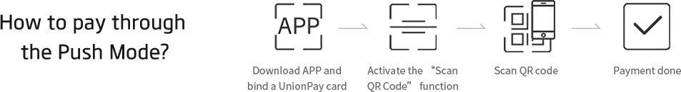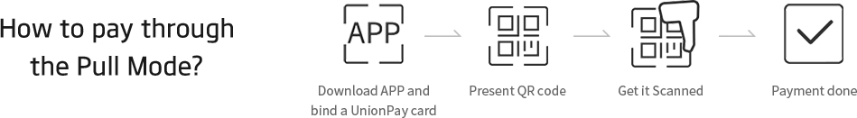 UnionPay QR code payment offers P2P, P2B and B2B funds receiving and paying as well as value-added services via QR code. It mainly provides solutions for spending, transferring and cash withdrawal, and has two modes: the Push Mode (purchasers use their mobile App to scan the QR code presented by the merchant to initiate the payment) and the Pull Mode (merchants use QR code reader to scan the QR code in customer’s App to initiate the payment).